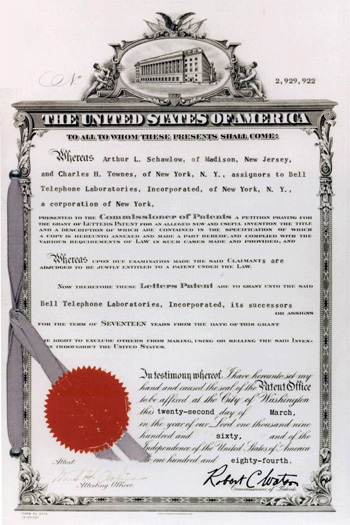 Two years later, Schawlow and Townes received a patent for the invention of the laser, the same year a working laser was built by Theodore Maiman at Hughes Aircraft Company.